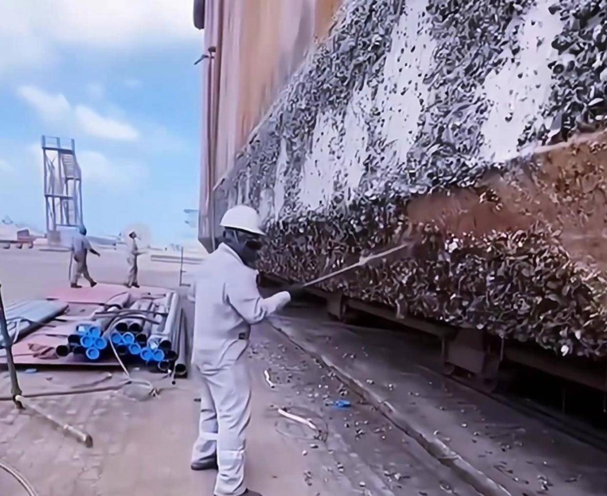 (清理藤壶)水兵们得先用高压水枪给它们来个“水漫金山”,然后再挥动特制钢铲,这样才能把它们从船底刮下来。这活儿听起来就累得慌,事实也确实如此。
